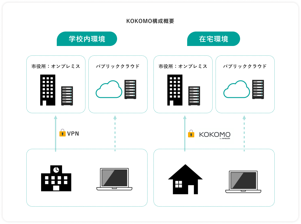 そこにKOKOMOを導入することで、在宅環境で市役所にアクセスする時にはKOKOMOによる仮想SIMによる認証でセキュアにアクセスし、パブリッククラウドで利用できるシステムとは直接通信する環境を構築。今まで必要だった切り替え等の操作が不要となり、安心・安全な環境であるうえに、「便利になった」という声が届いている。